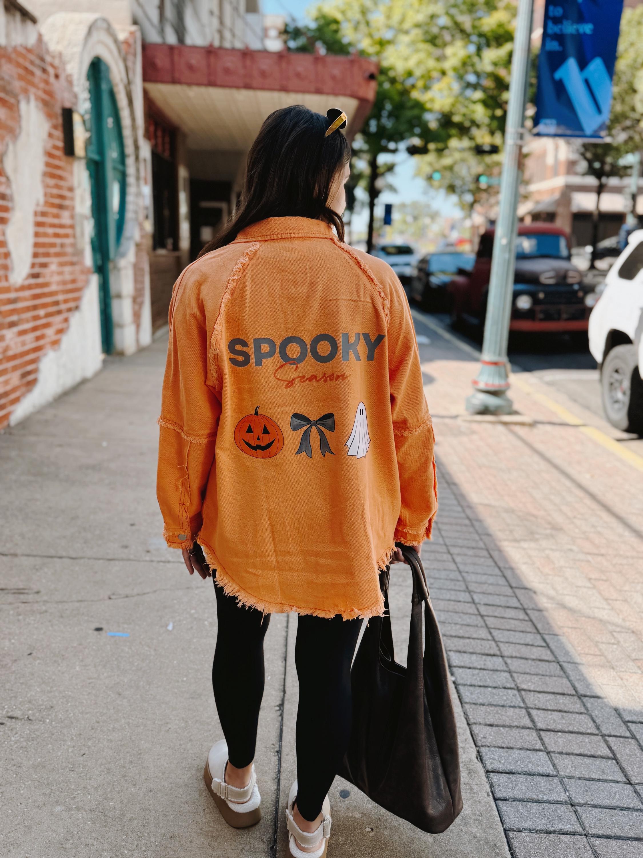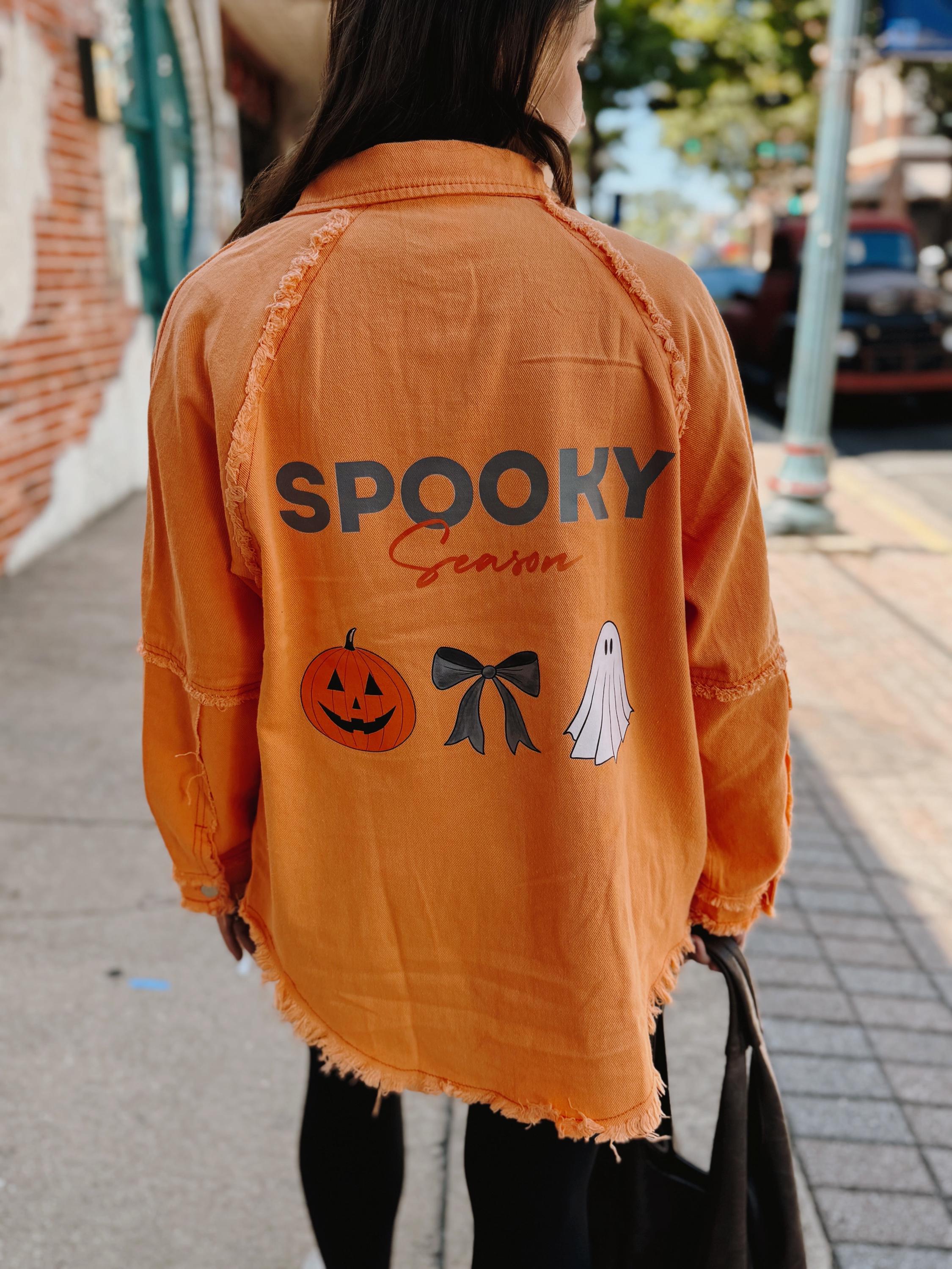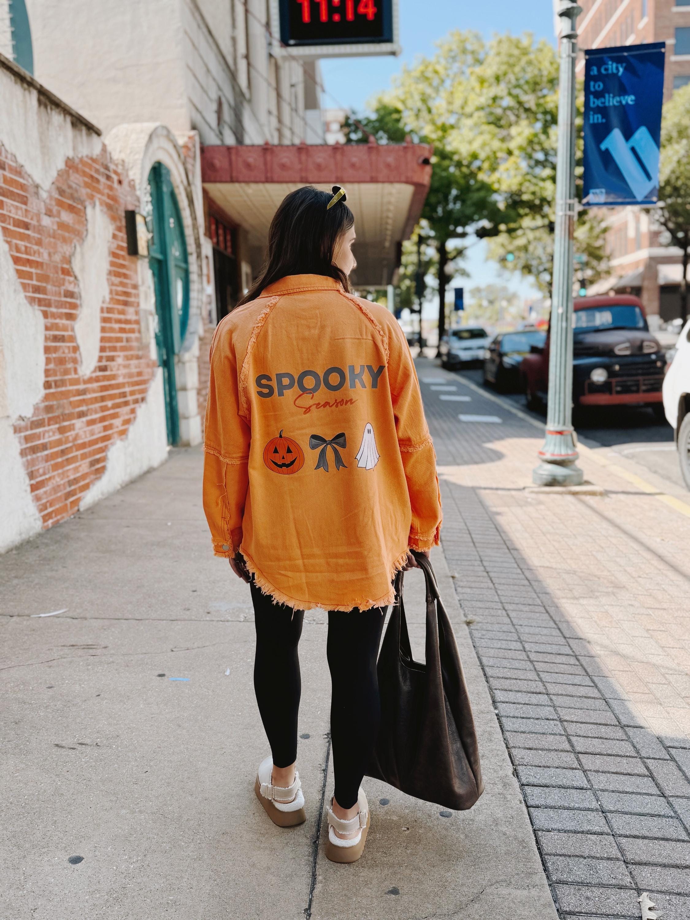 Spooky Season is here! 🎃🎀👻Our orange denim jacket is just the thing you need to get festive this season. Business in the front, party in the back! A staple in your closet this fall!