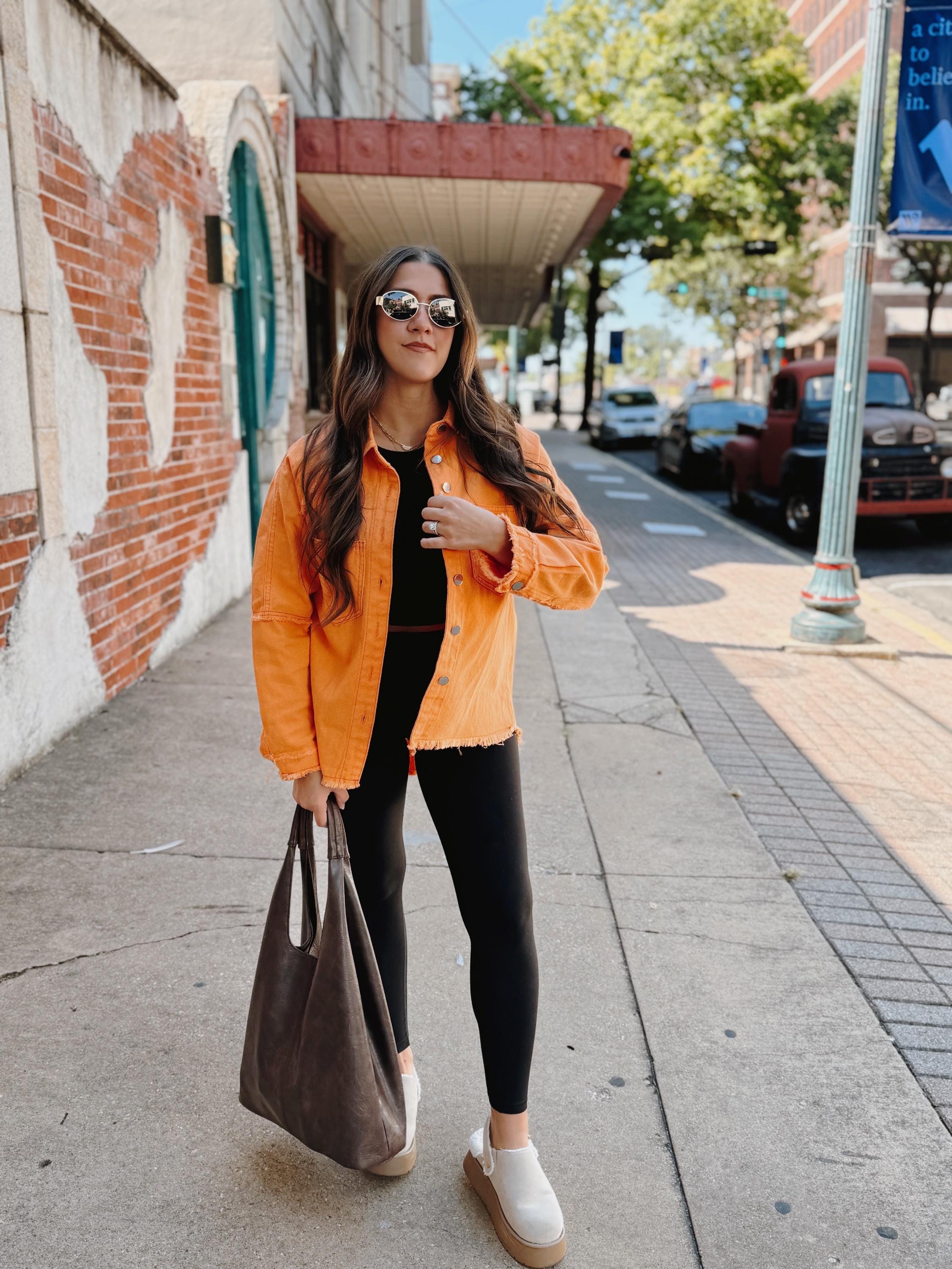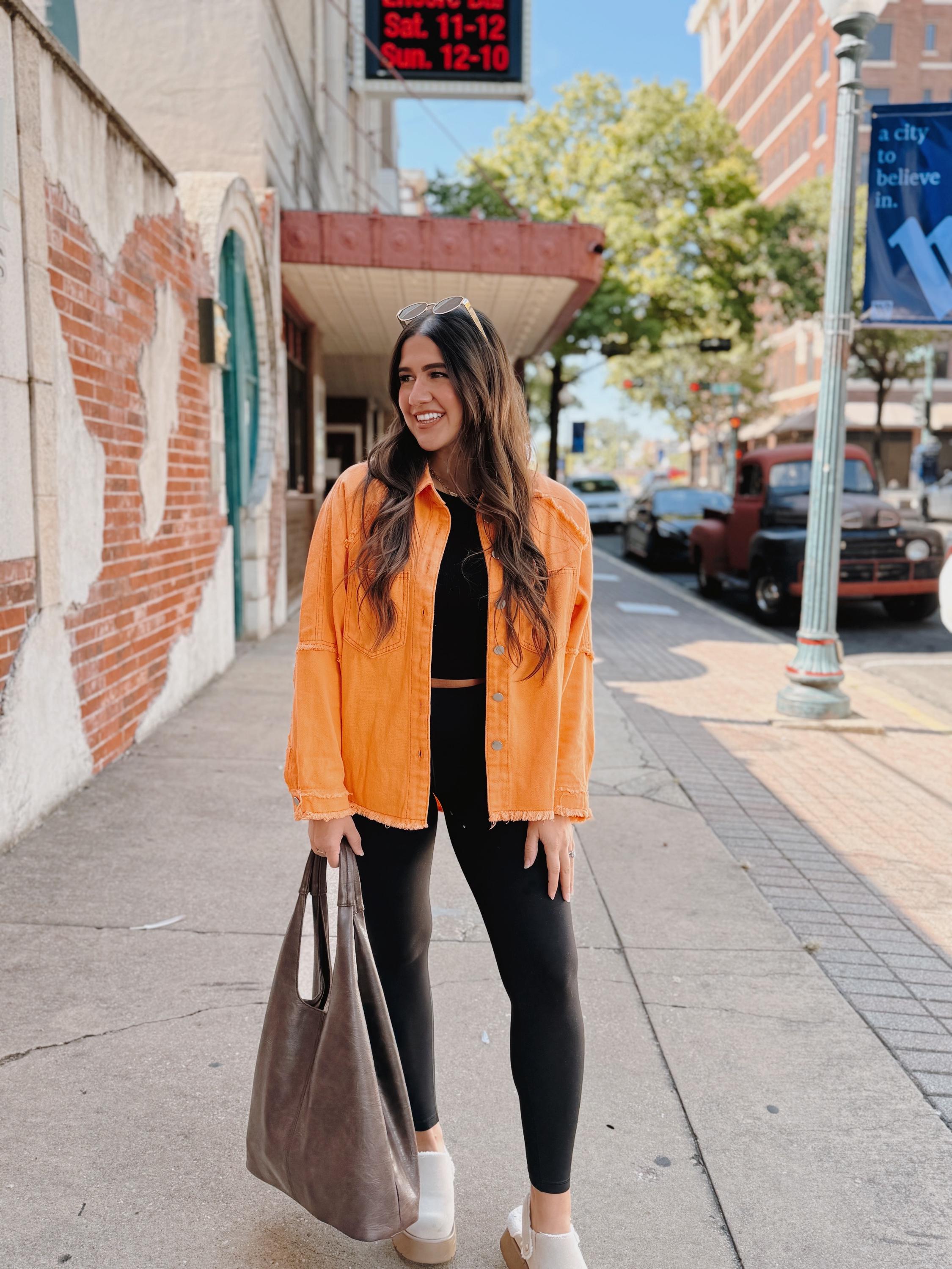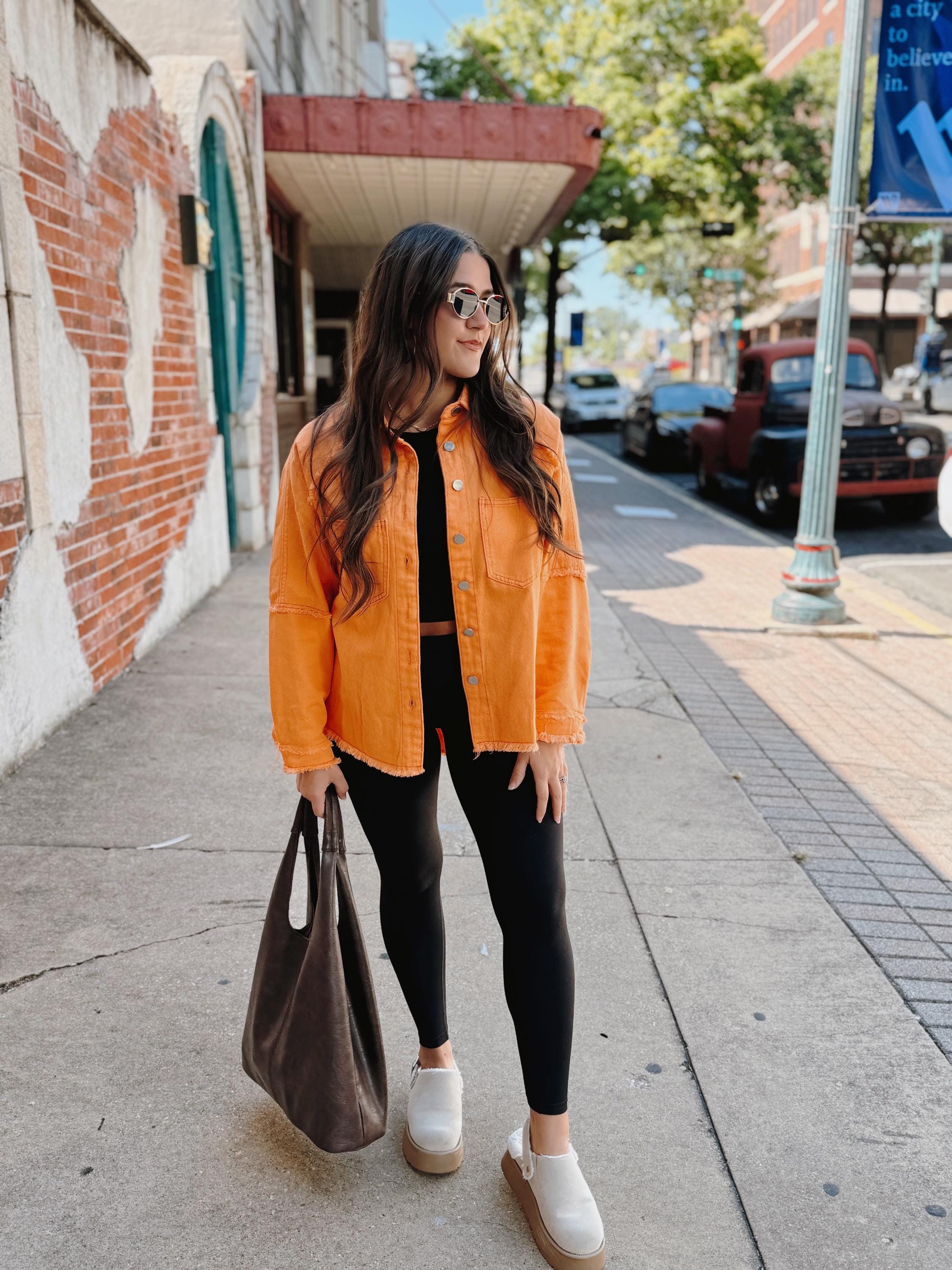 Spooky Season is here! 🎃🎀👻Our orange denim jacket is just the thing you need to get festive this season. Business in the front, party in the back! A staple in your closet this fall!
